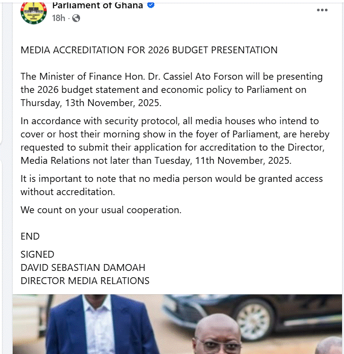 A statement issued by Parliament said that in accordance with security protocol, all media houses that intend to cover or host their morning show in the foyer of Parliament are hereby requested to submit their application for accreditation to the Director, Media Relations not later than Tuesday, 11th November, 2025.