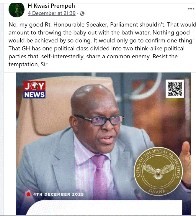 Reacting to him, in a Faceboom post, Prof Prempeh said “No, my good Rt. Honourable Speaker, Parliament shouldn’t. That would amount to throwing the baby out with the bath water.