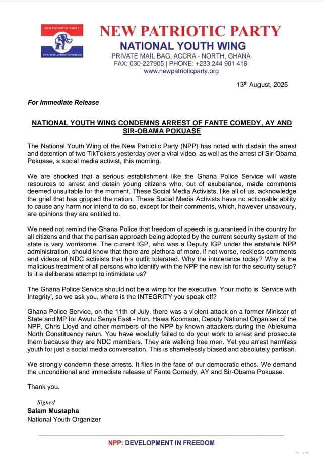 The National Youth Wing of the New Patriotic Party (NPP) has criticised the Ghana Police Service over the arrest and detention of TikTok personalities Fante Comedy and Akosua Jollof, as well as social media activist Daniel Adomako, popularly known as Sir-Obama Pokuase, calling the actions “shamelessly biased” and “absolutely partisan.”