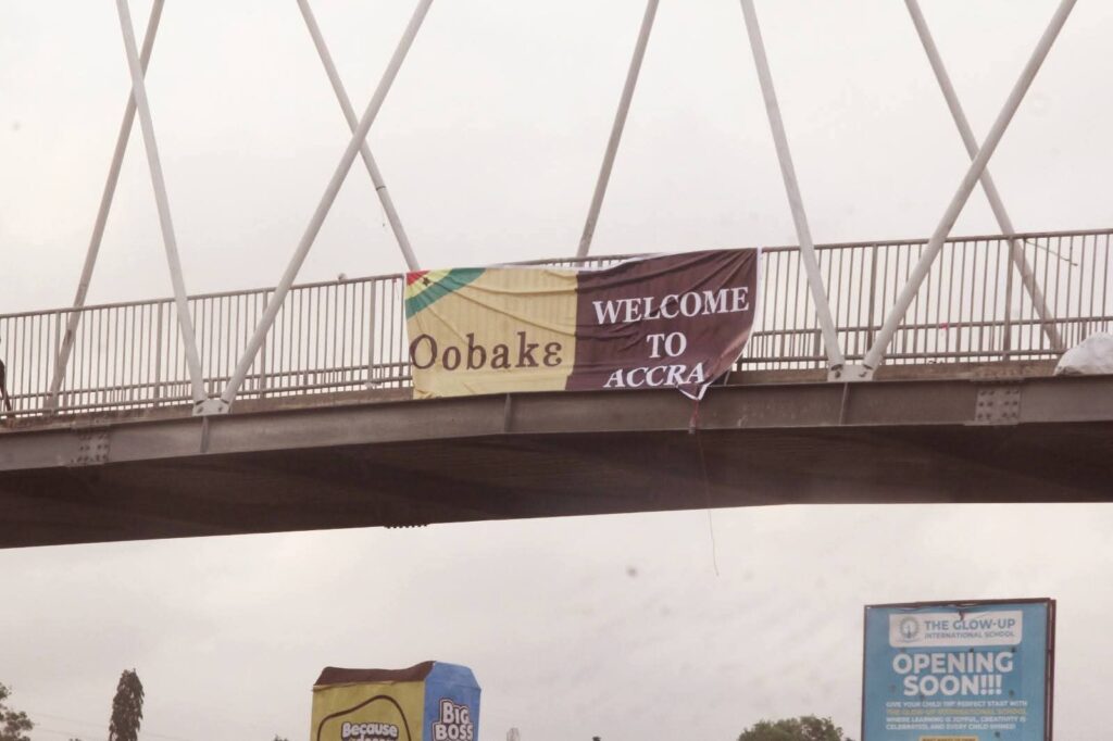 At each of these locations, the banners stand out with bold fonts and the colors of Ghana’s national flag, often strung across pedestrian bridges, mounted on walls, or displayed at intersections.