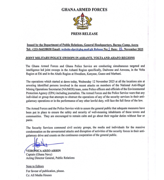 The Ghana Armed Forces (GAF) and the Ghana Police Service have launched simultaneous intelligence-led operations across multiple regions to arrest individuals involved in recent violent attacks on members of the National Anti-Illegal Mining Operations Secretariat (NAIMOS) team, police officers, and officials of the Environmental Protection Agency (EPA), including journalists.